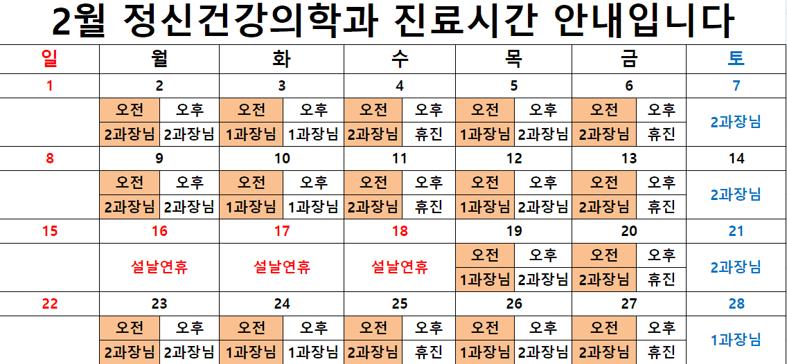 2026년 2월 정신건강의학과 진료시간 안내
