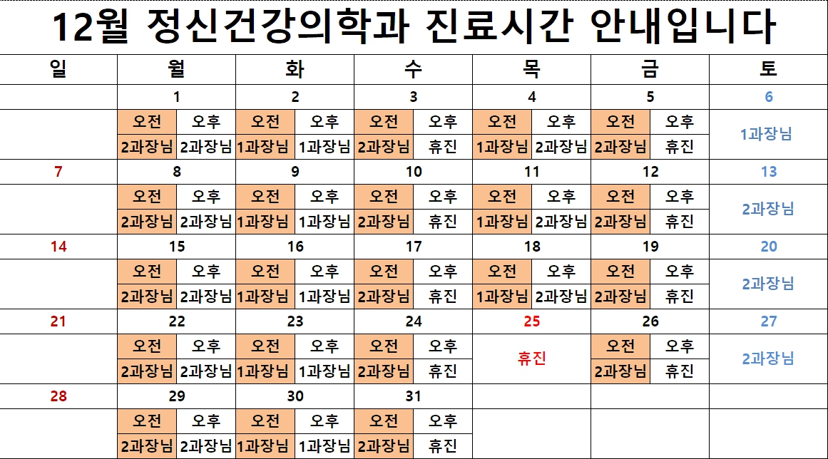 2025년 12월 정신건강의학과 진료시간 안내